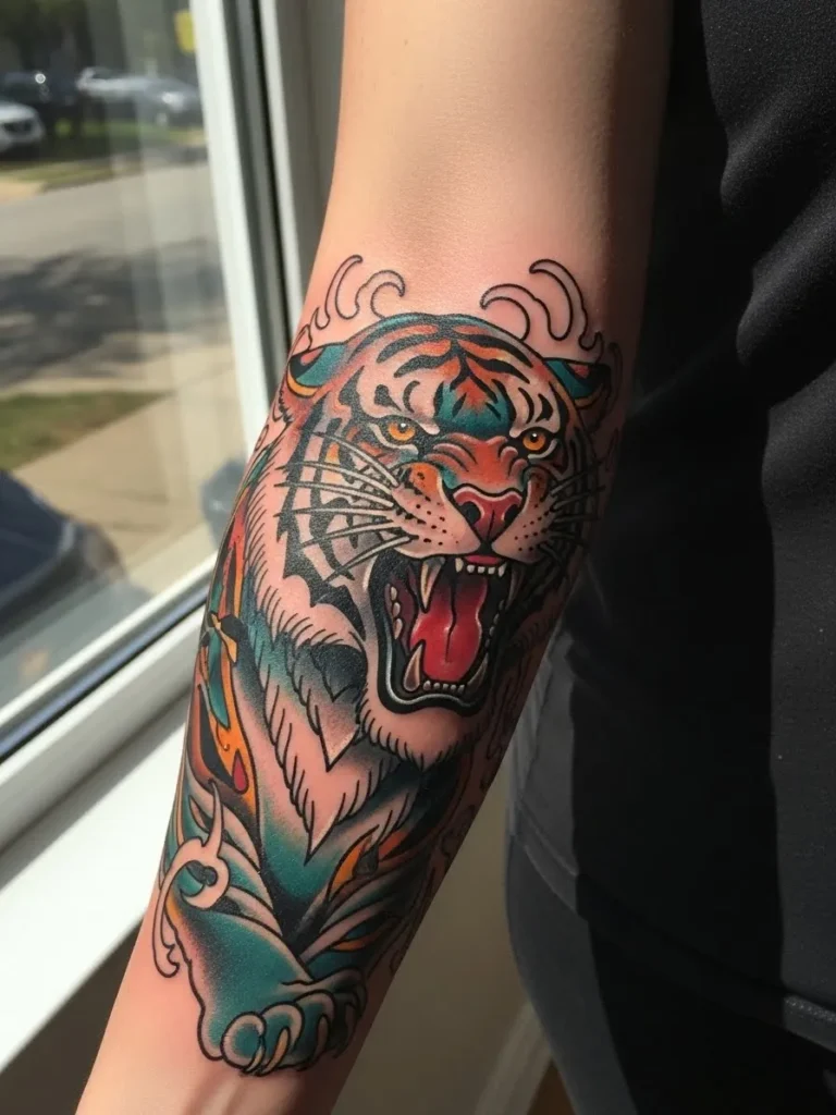 This bold neo traditional tiger stretches along the forearm with a large and dramatic layout that shows off every detail. The stripes are deep and clean while the teal shading adds a fresh twist to the classic orange and black palette. The open roar gives the whole piece a fearless feel and the smooth color blends look gorgeous against the skin.