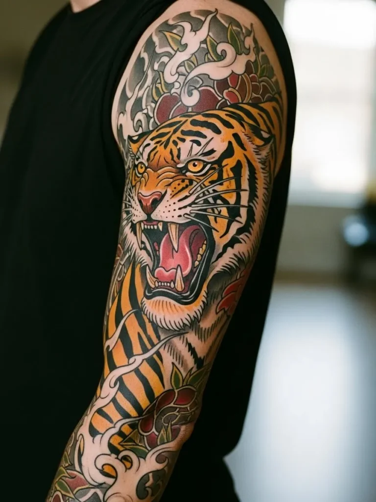 This large neo traditional sleeve features a roaring tiger wrapped in swirling smoke and leafy shapes. The oranges and yellows stand out against the darker background elements and the strong outlines give the tiger so much presence. The full arm layout makes the whole piece feel intense and expressive.