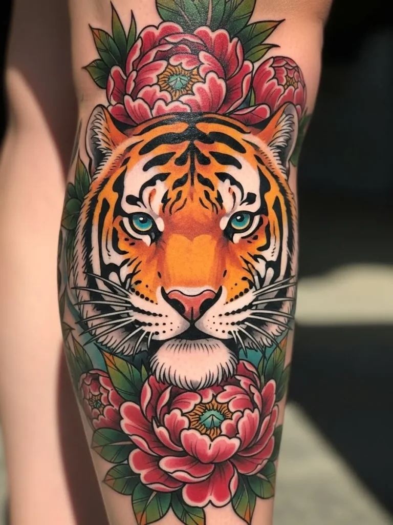 This neo traditional leg tattoo showcases a stunning tiger portrait surrounded by large blooming peonies. The bright teal in the eyes gives the whole design a captivating glow and the soft gradients in the petals add a beautiful contrast to the rich orange fur. The placement on the thigh gives it plenty of room to breathe.