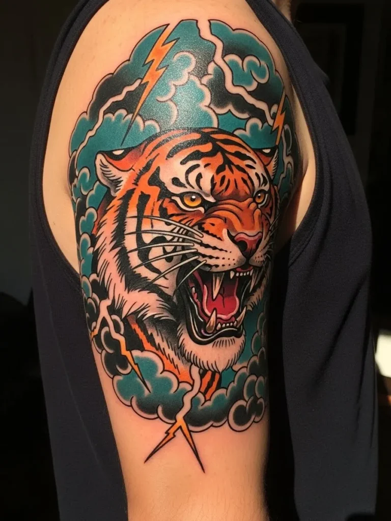 This neo traditional shoulder tattoo features a roaring tiger surrounded by teal storm clouds and bold lightning bolts. The oranges and blacks in the tiger contrast beautifully with the bright electric yellow strikes and the whole piece sits perfectly on the upper arm. The clean linework and saturated color make it feel strong and fearless.