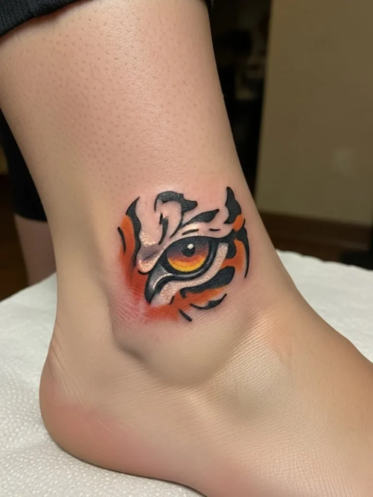 This small neo traditional ankle tattoo shows a single tiger eye framed by sharp black stripes and warm orange shading. The placement at the ankle keeps it subtle while the bright highlights make the eye look intense and captivating. The soft red glow around the design adds a touch of heat.