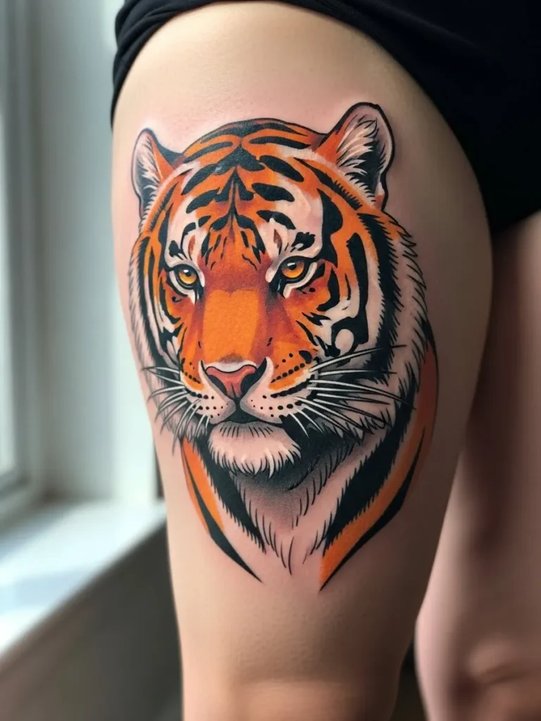 This medium sized neo traditional tiger portrait sits beautifully on the front of the thigh with smooth orange gradients and clean black striping. The shading under the chin softens the look and the placement gives the design plenty of space to show off all the detail. The overall feel is calm and confident.