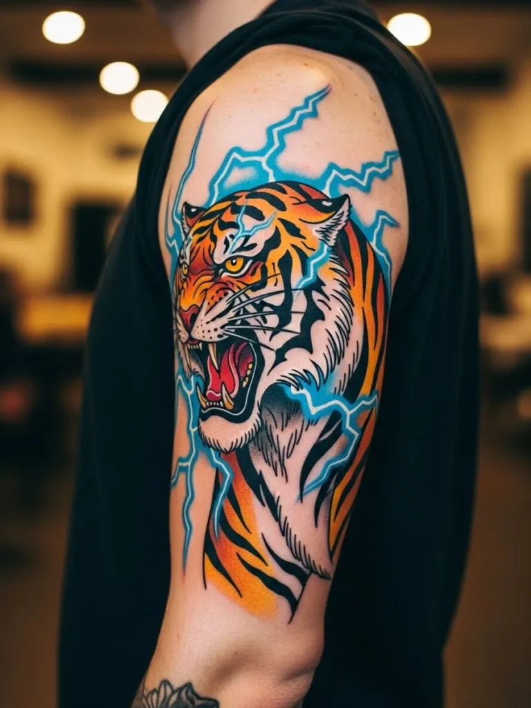This large upper arm tattoo features a roaring tiger surrounded by vivid electric blue lightning. The bright orange fur stands out so well against the cool tones and the bold outlines capture that classic neo traditional charm. The placement wraps around the arm in a way that adds movement and energy.