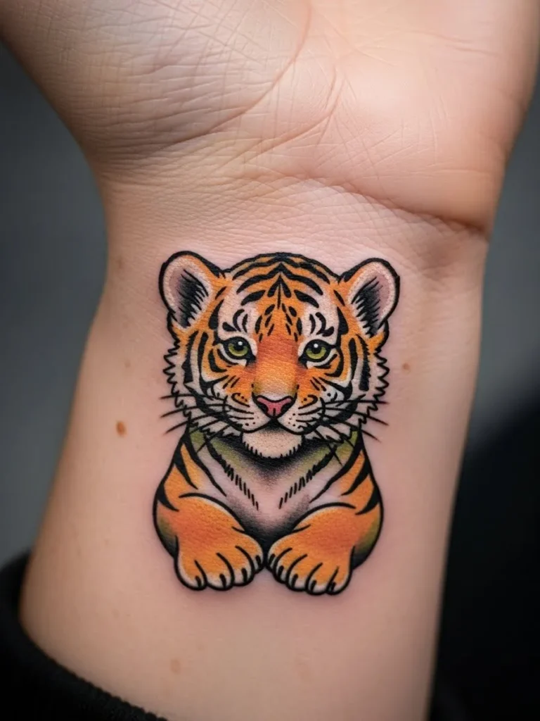 This small neo traditional wrist tattoo features an adorable baby tiger with soft orange shading and bright green eyes. The rounded shapes and tiny paws give it the sweetest look and the placement on the inner wrist makes it feel personal and cozy. The clean black lines keep it crisp and charming.