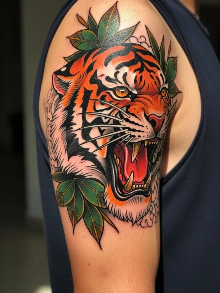 Vibrant Tiger Shoulder Tattoo With Leafy Details