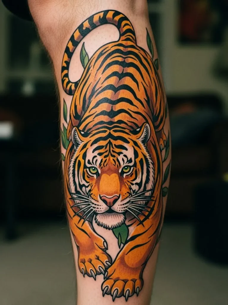 This neo traditional leg tattoo features a large crouching tiger that looks ready to spring forward. The lines are bold and graphic while the warm orange tones create a stunning contrast with the leafy green accents. The curved tail framing the composition adds a lovely flow to the entire piece.