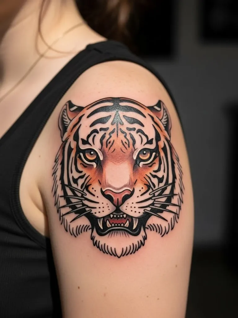 This medium sized neo traditional tiger head sits beautifully on the upper arm. The clean black outlines and soft orange shading give it a polished look while still keeping that fierce expression front and center. The placement hugs the curve of the shoulder in such a flattering way.