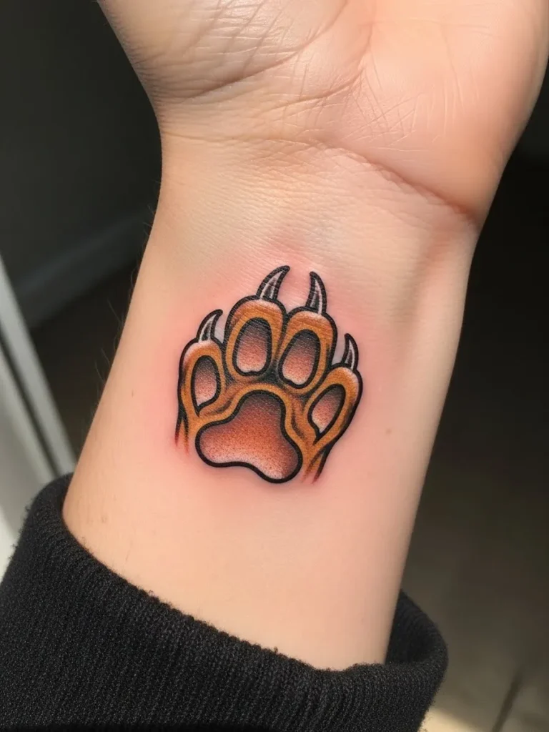 This small neo traditional paw print sits on the inner wrist with bright orange shading and tiny black claws to give it that playful tiger personality. The simple shape keeps it minimal while still adding that fun pop of color. The soft gradient and clean lines make it look polished and charming.