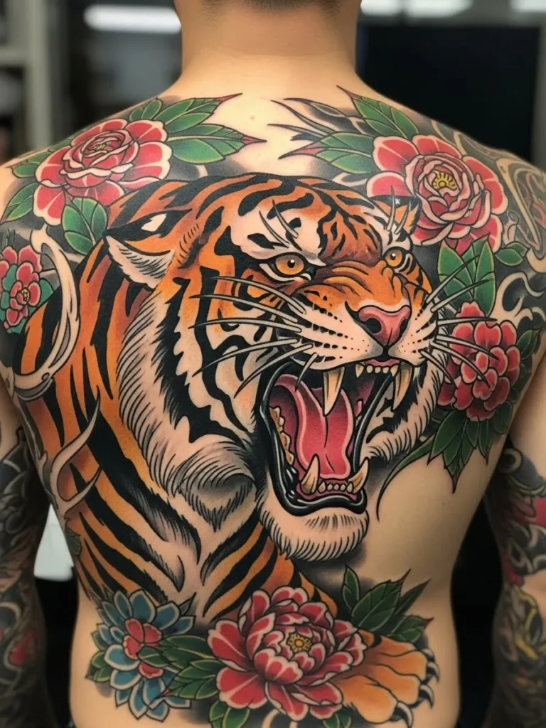 This massive neo traditional back piece features a roaring tiger surrounded by bright peonies and lush green leaves. The colors are vibrant with rich oranges and deep reds that flow across the entire back. The bold black linework gives the whole composition a strong shape while the floral details soften it beautifully.