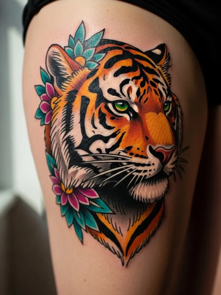 This large neo traditional tiger portrait sits on the upper thigh with vibrant teal and pink flowers framing the tiger’s face. The shading is rich and smooth with bright oranges and soft black gradients that highlight the eyes beautifully. The placement gives plenty of room for detail and it shows.