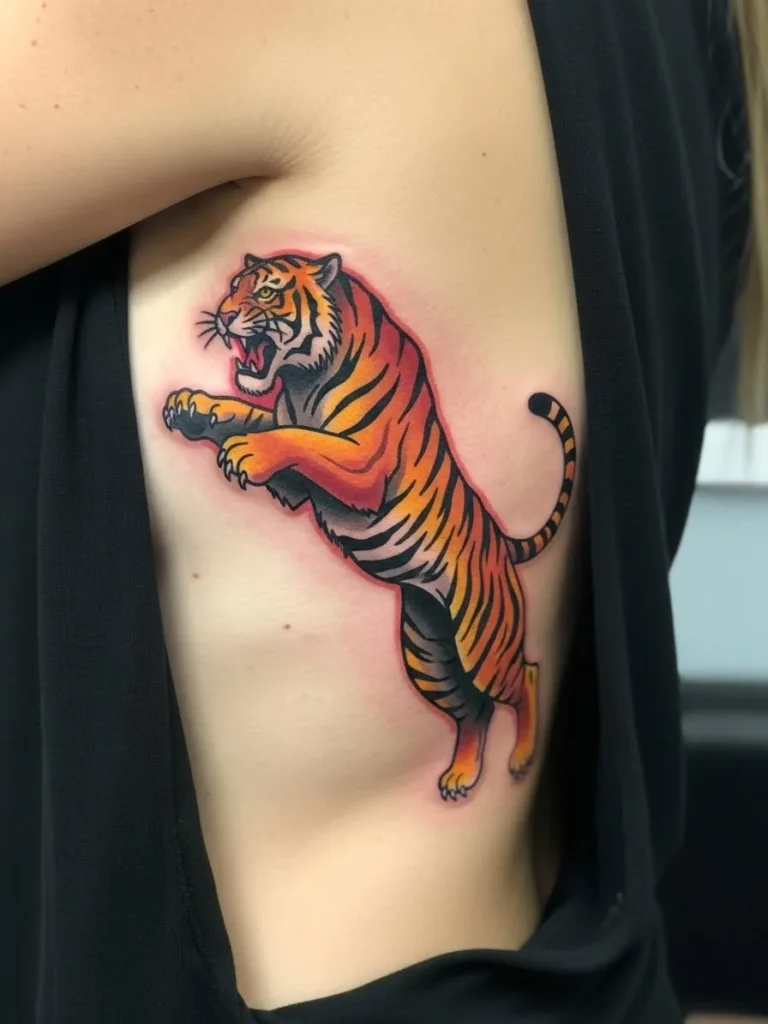 This neo traditional tiger sits along the ribcage with a medium sized layout that shows the full body in a vibrant jumping pose. The bright oranges and warm reds blend beautifully against the skin and the crisp black stripes make the whole piece feel bold and animated. The placement hugs the curve of the side in a way that feels both flattering and fierce.