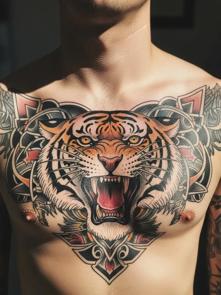 This large neo traditional chest tattoo features a roaring tiger head centered across the upper chest and framed with intricate ornamental shapes. The black linework is sharp and strong while the orange shading brings warmth and intensity to the overall look. The symmetry across the chest makes it feel powerful and balanced.