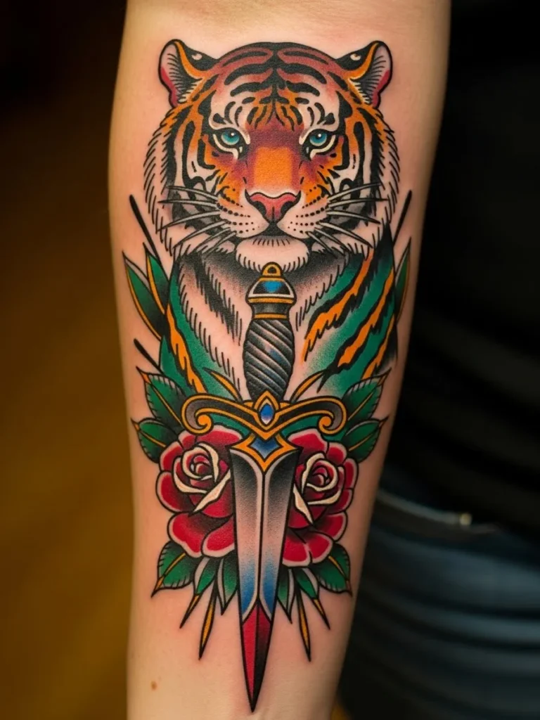 This neo traditional forearm tattoo pairs a calm yet intense tiger portrait with a long decorative dagger and two bold roses. The colors are vibrant with deep reds and bright oranges that pop against the green leaves. The layout is tall and elegant and fits perfectly along the forearm.