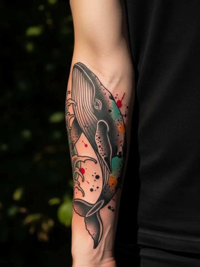 What we have here is a fantastic whale tattoo placed perfectly along the forearm, wrapping slightly to fit the shape of the arm for a cool, elongated look. It’s done in a traditional Neo-Traditional style, featuring a smooth, dark whale done with crisp lines and lovely grey shading on the body and flukes. The really fun detail is the background, which isn’t traditional waves but instead features playful, vibrant teal, yellow, and red watercolor splashes that bleed out around the main subject, giving the whole piece a modern, artistic edge.