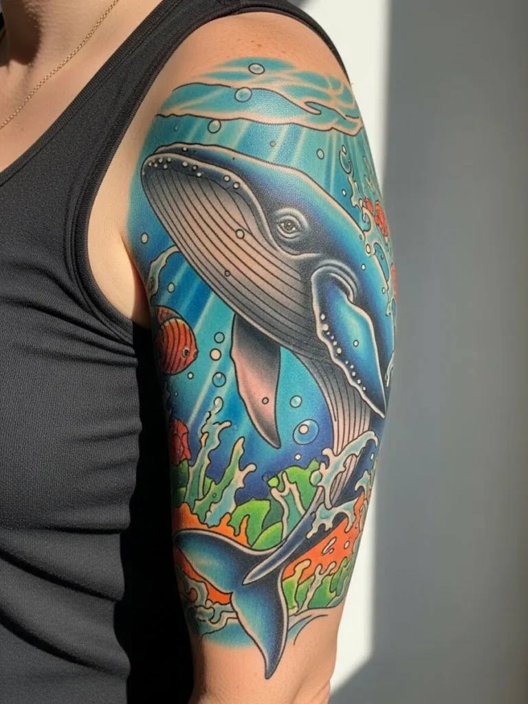 This colorful tattoo covers a large section of the upper arm, fitting perfectly as a gorgeous start to a sleeve or as a standalone piece. It depicts a majestic whale swimming toward the surface, rendered in dazzling blue hues with bright white highlights that make it look like light is catching it underwater. The Neo-Traditional style shines through in the bold outlines and super saturated colors, with the background filled with vibrant aqua water, bubbles, and a lively coral reef section below, complete with tiny orange fish swimming around the whale.