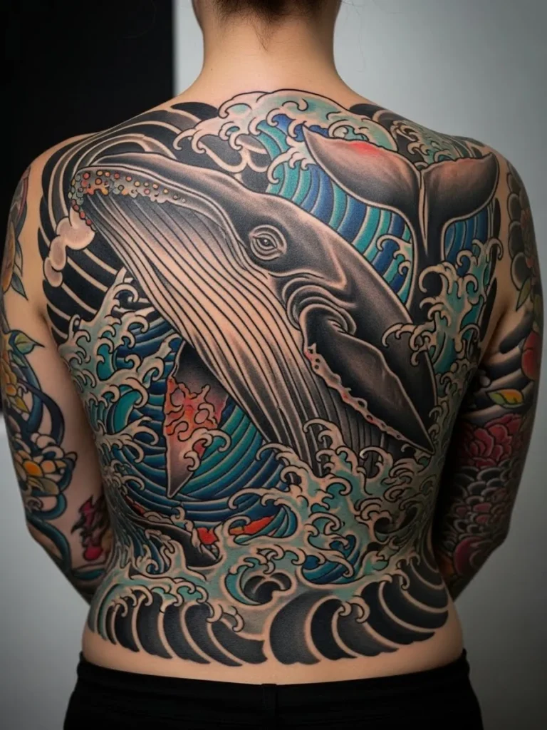 This incredible piece is a monumental full back tattoo that extends from the upper back right down to the lower waist, flawlessly blending with surrounding sleeve work. It features a colossal whale breaching dramatically out of churning waves, rendered in a powerful Neo-Traditional style heavily influenced by Japanese irezumi art. The whale itself is done in super detailed black and grey with striking white highlights, contrasting beautifully with the turbulent ocean backdrop of rich teals, deep blues, and dynamic black waves. You can even spot a hint of warm red and orange fire or sun detail tucked into the lower waves, adding a dramatic, almost mythological feel.