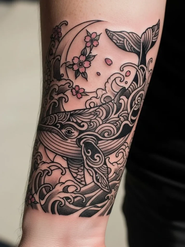I think this piece is absolutely mesmerizing because it blends the classic strength of a Neo-Traditional whale with the sophisticated elegance of Japanese tattooing. The monochromatic look with just those sweet, soft pink flower accents is so chic and striking, and it gives the usually powerful whale a gentle, ethereal quality. It truly feels like a quiet, strong protector rising from the moonlight and cherry blossoms, which makes it incredibly beautiful and meaningful for anyone who loves ocean themes with an artistic twist.