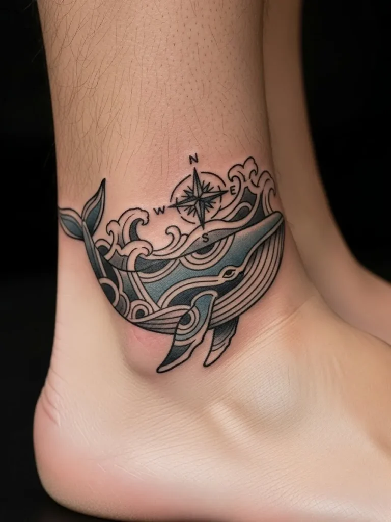 I am absolutely drawn to the symbolism here; the whale represents deep emotional connection and intuition, and pairing it with the compass is just brilliant because it suggests finding your way through life’s emotional waters. It’s a wonderful reminder that even when things get turbulent, you have your own inner guidance to lead you home. Plus, the placement on the ankle is just so cute and unexpected—it’s like having a little secret of the ocean traveling with you everywhere you go!