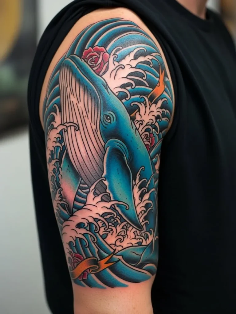 Here we have a striking neo-traditional half-sleeve piece that wraps beautifully around the bicep, focused entirely on a large, powerful whale swimming through a sea of incredibly dynamic waves. The color scheme is predominantly a saturated, vibrant blue in various shades, creating amazing depth and movement in the water, which contrasts beautifully with the stark white foam and the delicate pink shading on the whale’s belly. There are little touches of traditional imagery thrown in, like the pop of red in the roses nestled among the waves and a tiny orange banner flowing through the background, which adds a bit of classic tattoo romance to the whole scene.