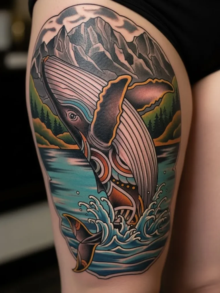 This large, neo-traditional tattoo is beautifully framed on the upper thigh, featuring a magnificent whale breaching out of a lake with a dramatic mountain landscape behind it. The design is encapsulated in a circular frame, giving it a cool, badge-like look, and the color palette is a lovely mix of earthy tones and cool blues. You can see the dark grey peaks of the mountains contrasting with the vibrant greens of the pine trees and the rich, warm oranges of the distant hills. The whale itself has crisp white baleen lines and is accented with an unexpected but gorgeous geometric pattern in warm oranges and browns around its pectoral fin, adding that distinctive neo-traditional flair to this unusual aquatic/terrestrial mashup.