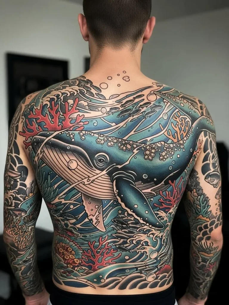 I am completely obsessed with how this design uses the entire back as a canvas to tell a beautiful underwater story. The sheer scale and the incredible detail make it feel like a window into the ocean, and the way the waves and coral frame the whale is just pure artistic genius. It has such a powerful yet serene vibe, and I think it would look absolutely stunning on anyone who feels a deep connection to the ocean and wants a seriously grand piece of body art.