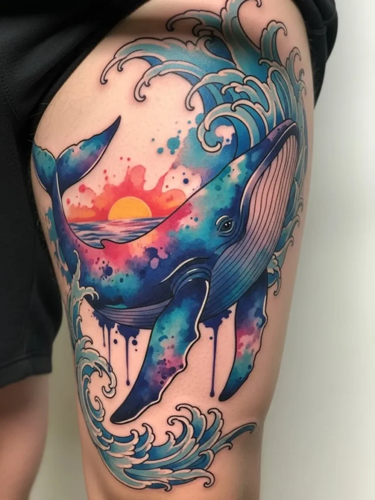This absolutely stunning large-scale tattoo is perfectly placed on the thigh, utilizing that spacious canvas to create a truly mesmerizing scene. The style is a fantastic fusion of neo traditional structure and vibrant watercolor techniques, giving the entire piece a dreamy and artistic feel. A massive whale is depicted amidst dynamic, churning waves, with a gorgeous orange and yellow sunset glowing brightly in the background. The whale itself is a kaleidoscope of deep blues, turquoise, magenta, and even some dripping effects, all outlined with crisp, dark lines typical of the neo traditional look.