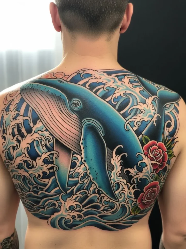 This incredible tattoo is a huge neo-traditional backpiece that commands attention across the entire upper back, flowing beautifully down towards the lower back. It showcases a magnificent blue whale powerfully riding through dramatic, cresting waves rendered in that classic Hokusai style but with a neo-traditional twist, using rich blues and deep teals for the water and the whale itself. The design is given an extra pop of color and romance with a few vibrant red and pink roses tucked into the waves near the whale’s tail, all outlined with those signature bold, black lines.