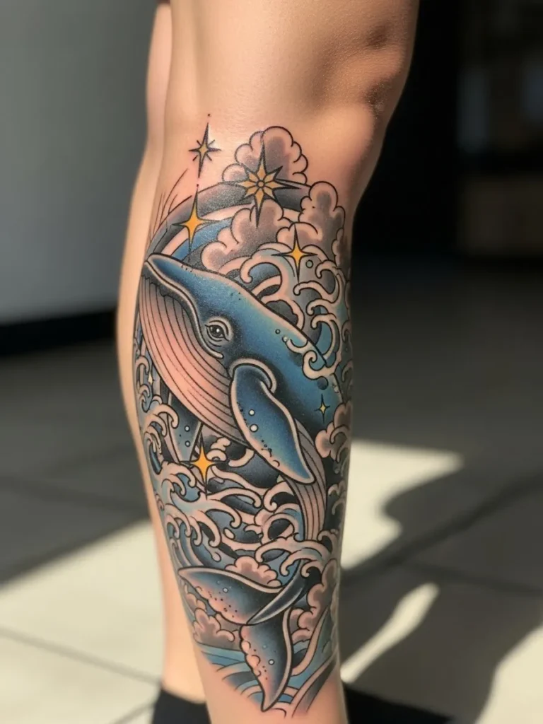 This stunning neo traditional piece is wrapped beautifully around the calf, using the length of the leg to give the design an impressive vertical flow. The tattoo features a majestic blue whale surging through dynamic waves and dramatic, swirling storm clouds, creating a powerful, moody scene. The color palette centers around rich blues and cool gray tones for the water and clouds, contrasting perfectly with the pale pink and white details on the whale’s belly. Adding a magical element are scattered, twinkling stars and cosmic bursts of light, which are rendered in bright yellow and white, making the whole image feel both grounded in the ocean and connected to the heavens.