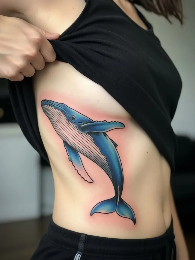 This breathtaking tattoo is a large, sleek piece perfectly contoured to the curves of the ribcage and side, showcasing the majestic scale of the whale. Done in a beautifully saturated neo traditional style, the design features a massive blue whale with incredibly detailed shading that gives it an almost realistic, three-dimensional look. The colors are striking, utilizing deep blues and lighter, silvery tones for the body and fins, but what truly makes it stand out is the soft, reddish-pink halo of color surrounding the creature, mimicking the warm glow of sunlight filtering through the water or a stunning sunset.