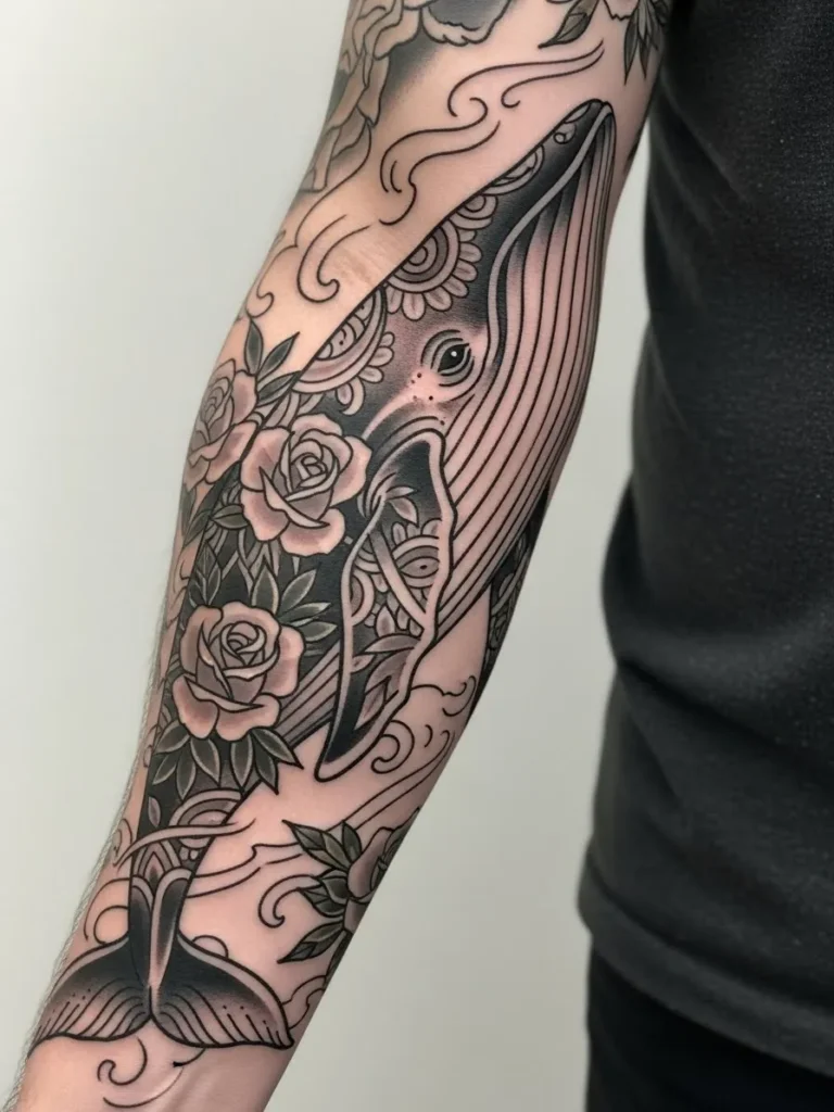 This large, striking neo traditional tattoo runs gracefully along the forearm, creating a powerful sleeve foundation. The design features a majestic whale rendered entirely in black and gray, with beautiful ornamental patterns decorating its head and body, giving it a unique, decorative style. It’s framed by soft, swirling clouds and accented by several stunning black and gray roses and leaves, adding a gorgeous element of classic tattoo flora to the oceanic subject. The lines are bold and clean, creating high contrast that makes the intricate shading and patterns really pop against the skin.
