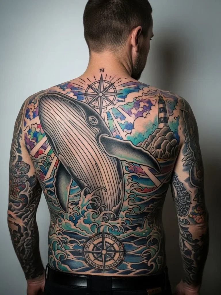 What I absolutely adore about this design is the sheer scale and the incredible use of color against the mostly black and grey whale. It’s such an attention-grabber, and the Neo-Traditional approach gives everything this beautiful, punchy contrast. The whale itself symbolizes deep emotion and creativity, while the lighthouse represents guidance and safety, making this a truly meaningful statement piece. If you’re looking for a tattoo that screams adventure and mystery, this full backpiece has that powerful, epic feel we all want in a big piece of art.