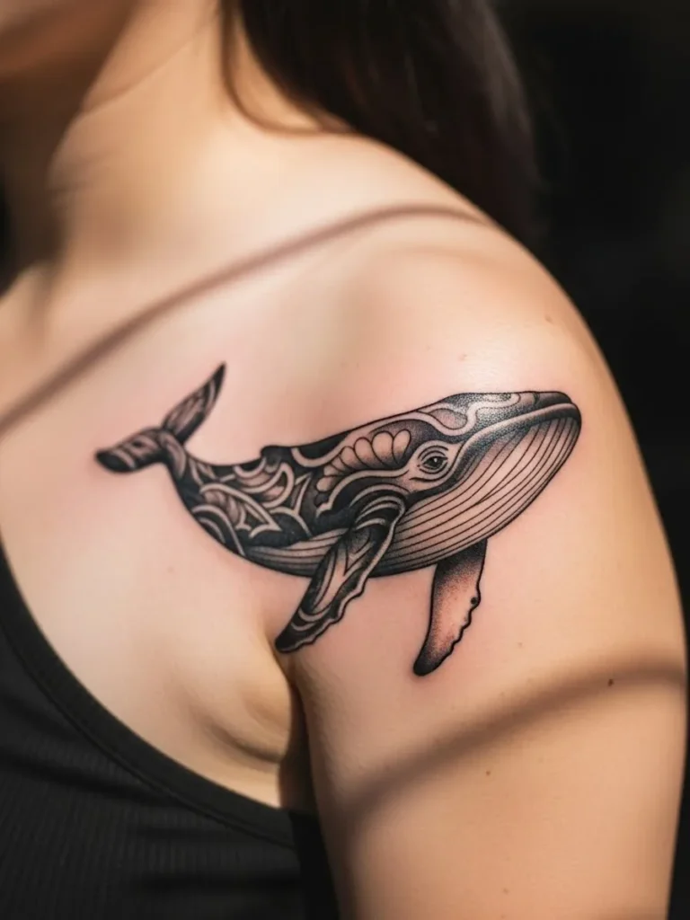 I think this design is so beautiful because it blends the raw power of the whale with a really soft, beautiful pattern work. The blackwork style is timeless and elegant, but the floral details elevate it beyond a simple animal piece. It feels like the kind of tattoo that is quietly strong, symbolizing a gentle spirit or a beautiful journey, and the shoulder is such a great spot for showing it off in a tank top or keeping it just for yourself when you’re wearing sleeves. If you’re into graceful yet strong designs, this is absolutely it.