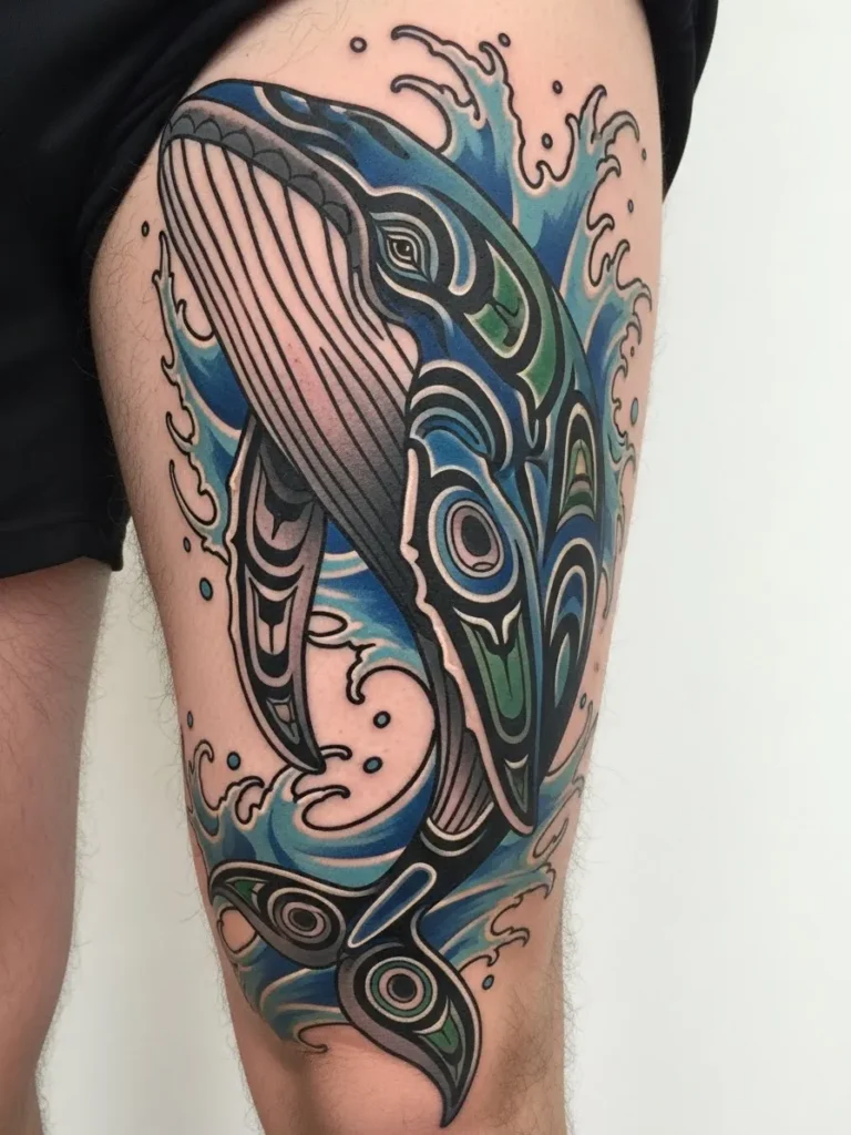 This huge tattoo is placed beautifully on the upper thigh, which is the perfect canvas for a piece this size and vibrancy. It’s a stunning interpretation of a Neo-Traditional whale, but what makes it super unique is the incorporation of indigenous Formline art on the upper body and fins, using bold black outlines and striking geometric shapes filled with bright blues and deep greens. The whale’s underbelly has those classic Neo-Traditional line striations, while the entire design is surrounded by dynamic, curling waves done in various shades of blue and white to really emphasize the movement of the breaching animal.