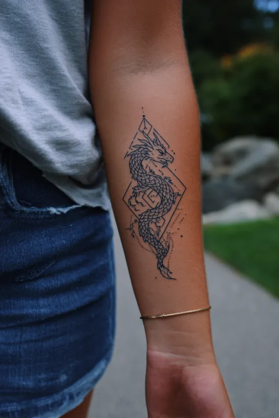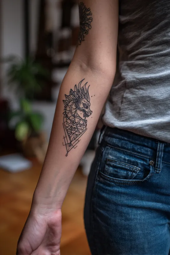 Here we see a more delicate approach with a fine line dragon centered on the inner forearm of a woman. The dragon is medium in size and lightly shaded, framed subtly with geometric elements that give it structure and balance. The placement runs vertically from mid forearm toward the wrist, keeping everything aligned and visually harmonious.