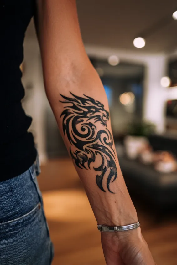 This forearm piece leans into tribal inspired styling with bold, flowing black shapes forming a dragon along the outer forearm of a woman. The curves are strong and symmetrical, wrapping slightly around the arm while still keeping the design balanced from elbow to wrist. The thick black ink creates a high contrast effect that feels graphic and striking.