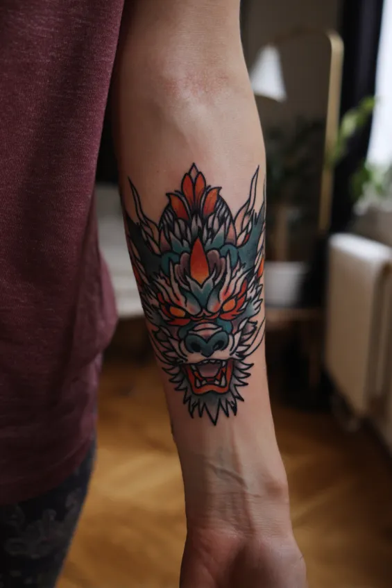 This tattoo showcases a striking neo traditional dragon face placed vertically on the outer forearm of a woman. Rich reds, greens, and deep blacks create bold contrast, while clean outlines keep the design structured and balanced. The size is medium to large, filling the forearm without spilling too far past the natural arm lines.