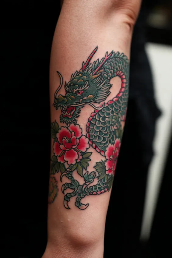 This forearm piece is a stunning neo traditional dragon in rich green tones with bold outlines and vibrant red flowers woven into the design. It covers a generous portion of the outer forearm and is placed vertically for perfect visual balance. The pops of red against the green scales create a polished contrast that feels intentional and artistic.