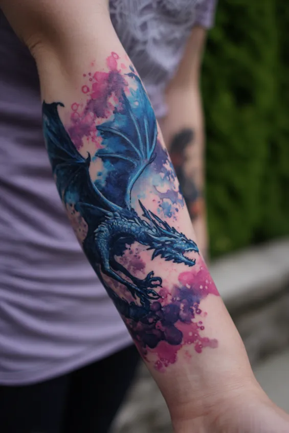 This piece brings in color with a watercolor dragon blending blues, purples, and soft pink tones along the forearm. The body flows vertically, while the splashes of color are carefully placed to maintain visual balance. The result is vibrant yet still polished.