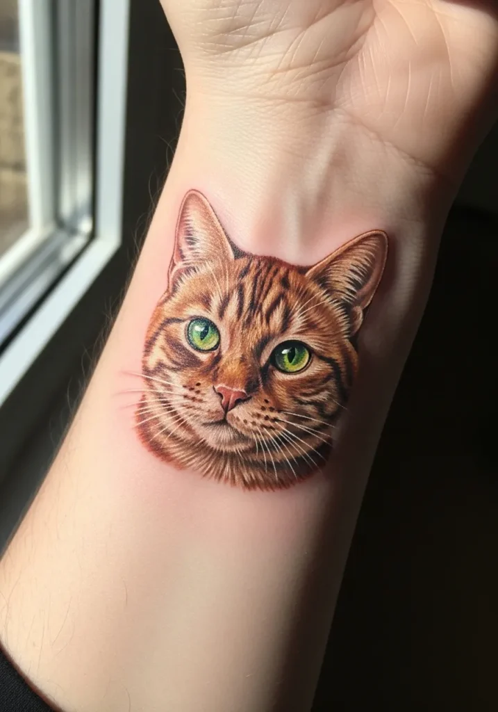 Green-Eyed Cat Wrist Tattoo