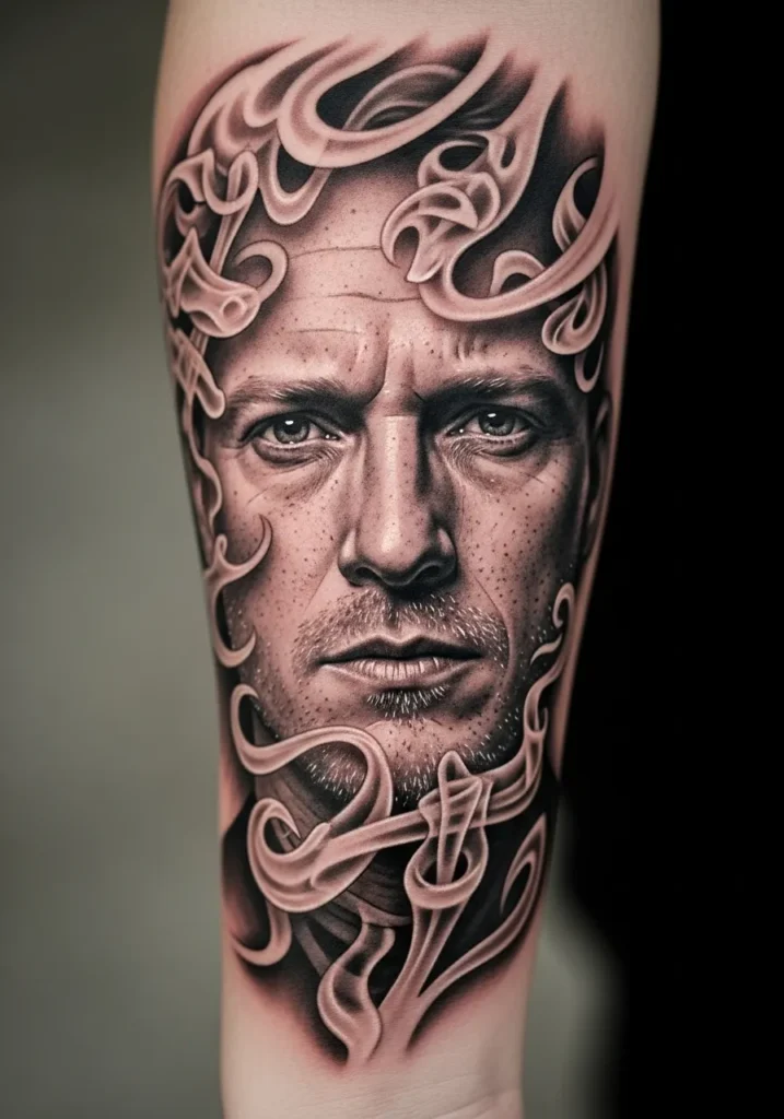 This forearm realism tattoo showcases a man’s face surrounded by soft, swirling smoke. The monochrome tones, intricate shading, and textured detail make the portrait look almost photographic. The flowing smoke adds a surreal and mysterious vibe, balancing realism with artistry.