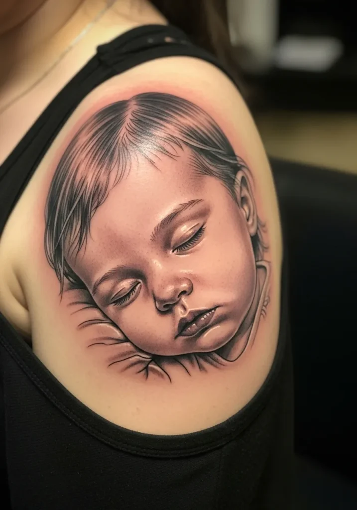 This shoulder tattoo depicts a sleeping baby resting peacefully, brought to life through soft black and gray shading. The fine lines, tender highlights, and delicate shadows make it look incredibly serene and lifelike. Every eyelash and curl of hair is perfectly rendered, adding a sense of stillness and love.