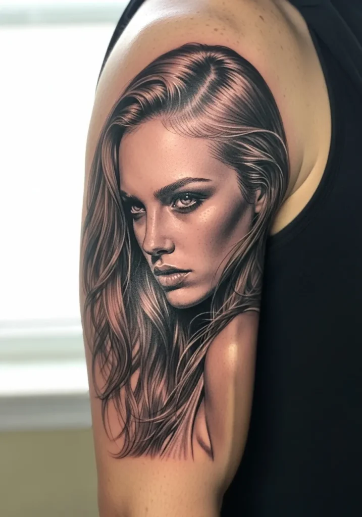 This upper arm tattoo features a strikingly realistic portrait of a woman with long flowing hair and a fierce, captivating gaze. The smooth shading and fine details in the eyes and lips make it look almost photographic. The use of soft light tones against darker shadows creates incredible dimension.