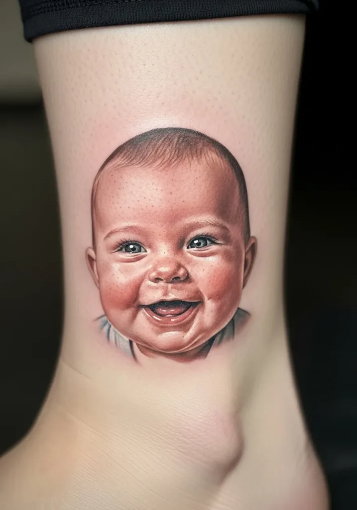 This ankle tattoo shows a baby’s face beaming with joy, brought to life with warm, natural tones. The subtle highlights on the cheeks and the twinkle in the eyes make the expression look unbelievably real. The placement makes it a sweet and personal piece, full of warmth and love.