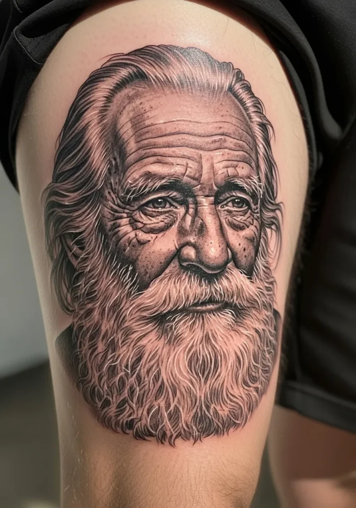 This detailed thigh tattoo of an elderly man captures every line, wrinkle, and strand of his hair with astonishing realism. The black and gray tones give the portrait a timeless quality, while the soft highlights bring out wisdom and kindness in his expression. The texture of his beard and the depth in his eyes are masterfully done.