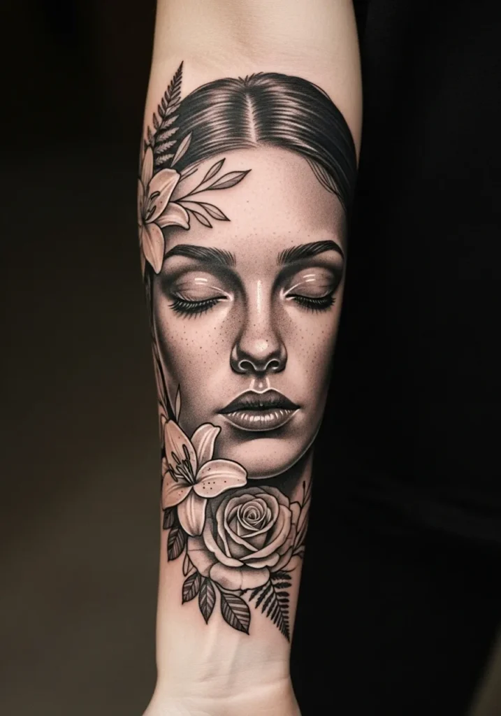 This forearm realism tattoo features a peaceful woman with her eyes closed, surrounded by detailed lilies, roses, and leaves. The soft grayscale tones and impeccable shading give the piece a velvety, lifelike finish. Each petal and strand of hair is inked with precision, creating a beautifully balanced mix of calm and strength.