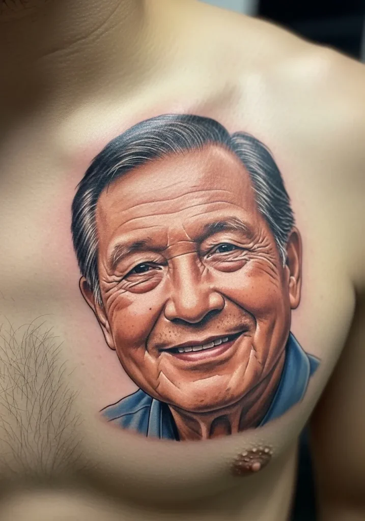 This chest tattoo captures an elderly man’s warm smile in stunning detail. The realism is impeccable, with every wrinkle, fold, and soft reflection on the skin rendered to perfection. The artist’s use of warm tones brings the face to life, radiating wisdom and kindness.