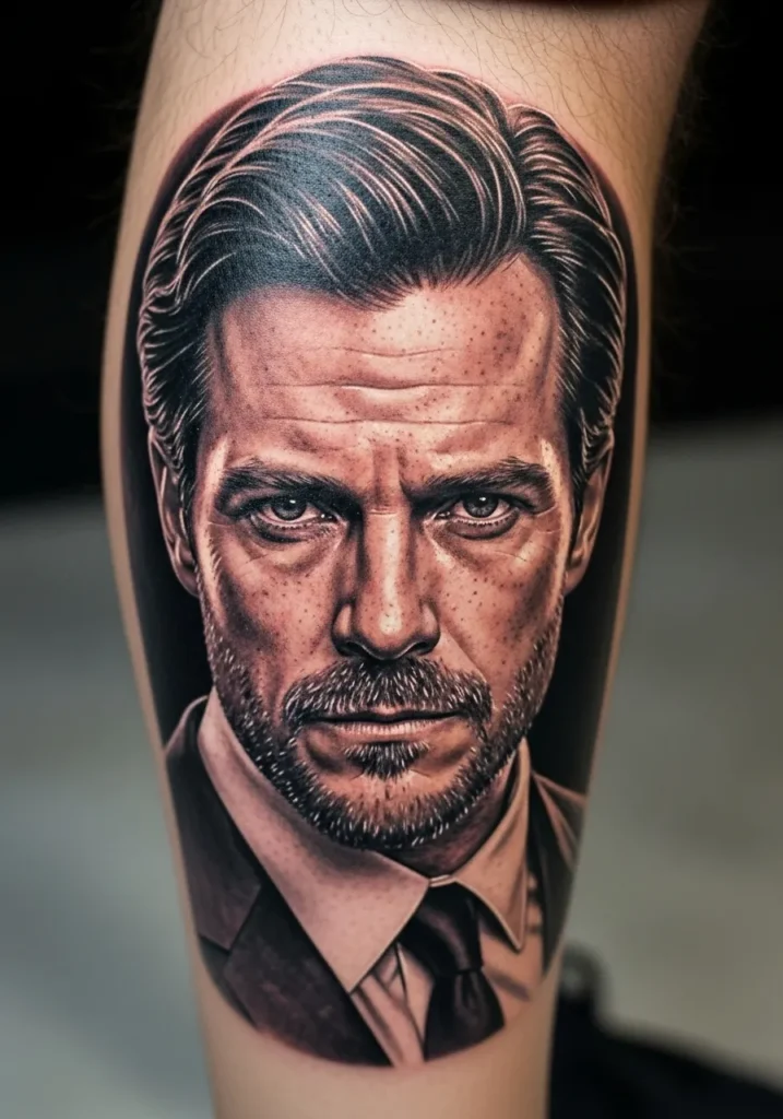 This leg tattoo showcases a sharply detailed portrait of a man in a suit, done in realistic tones with smooth gradients and subtle highlights. The crisp lines around the jaw and eyes give it a cinematic look, while the focused expression commands attention.