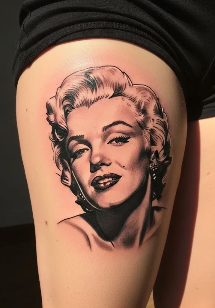 This black and gray realism tattoo pays homage to a timeless beauty with stunning depth and contrast. Inked on the upper thigh, the design features bold shadows, soft gradients, and that unmistakable old-Hollywood charm. Every strand of hair, every subtle smirk, and every flicker of light has been captured so precisely it feels cinematic.