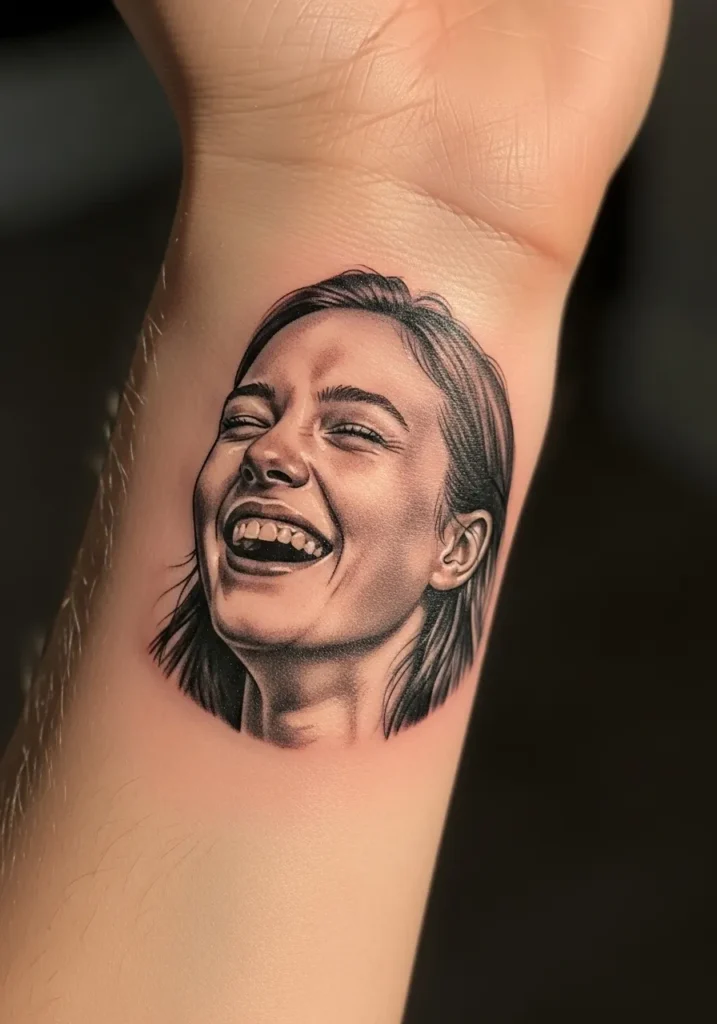 This small but striking wrist tattoo shows a woman laughing wholeheartedly, captured in fine black and gray realism. The details in her teeth, hair, and soft shadows around her face make the joy in her expression feel contagious.