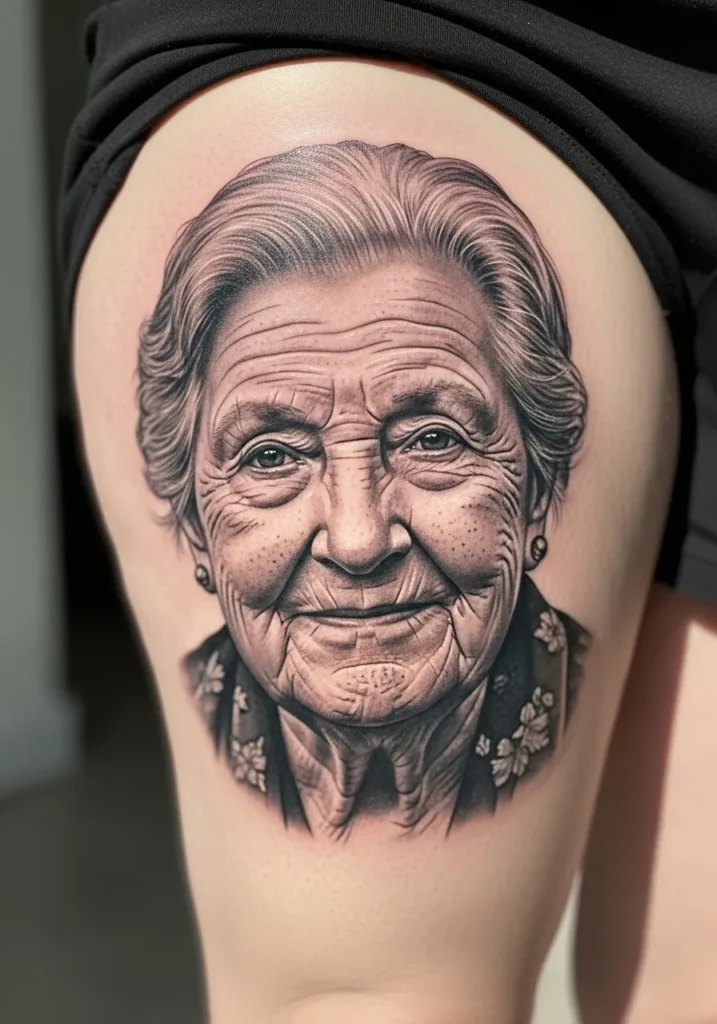This thigh tattoo portrays an elderly woman with gentle eyes and deep wrinkles, inked in stunning black and gray realism. The attention to detail is incredible, especially around the textures of her skin and hair. Her slight smile adds so much warmth and character.